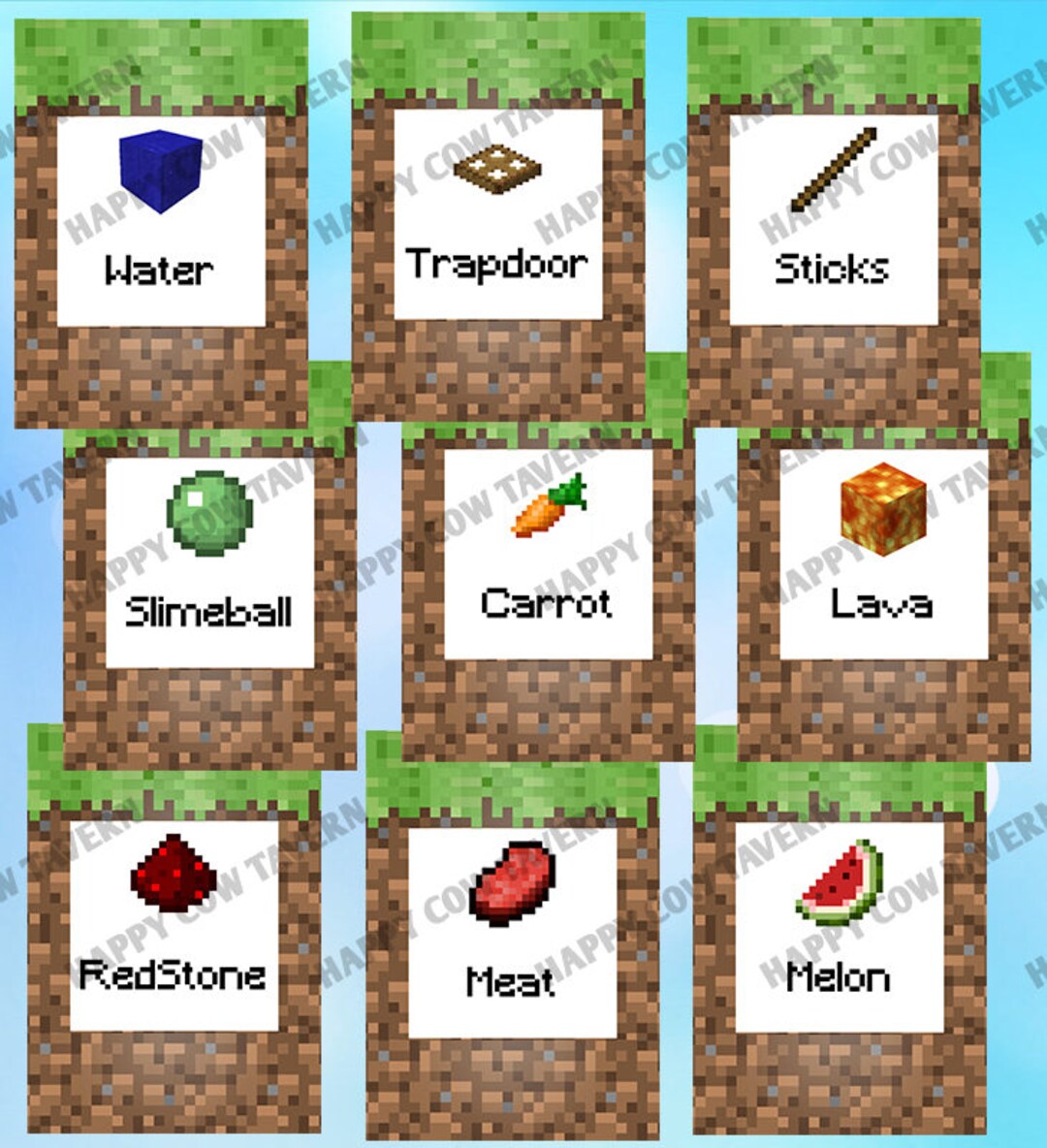 DIY Minecraft Birthday Party Part 2 | Supply List - Southern Revivals Here's all you need for a plentiful bounty of Minecraft inspired foods for you party table - Simply click on the links below, right click to download and print them out on cardstock. Minecraft Party Food Labels Lava, Lava Buckets, Cake & Sticks Food Labels Dirt Clod, Pork Chop, Fish & Mushrooms Food Labels Chicken, Coal & Carrots Food Labels Minecraft Birthday Party Food Labels. Free Printable! Now with Apples ... Minecraft Birthday Party Food Labels. Free Printable! Now with Apples instead of Melon! Menu based on: Dirt- Coco Crispy Treats; Sand- Rice Crispy Treats; Cake- birthday cake!; Sticks- Pretzel sticks; Cooked Chicken- Chicken Nuggets; Potatoes- Tater Tots; Emeralds- green grapes; Carrots- carrots!;